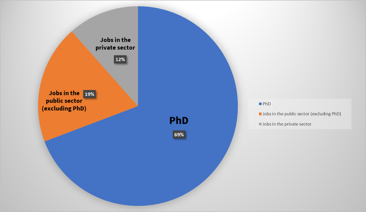 Vous trouverez ci-dessous des statistiques concernant d'anciens étudiants du master Erasmus Mundus BIOPHAM, ayant validé leur Master 2 (M2) à l'Université de Lille durant les années universitaires 2022-2023 et 2023-2024. Ces statistiques portent sur un échantillon de 26 étudiants. Après l'obtention de leur master, environ 69 % des étudiants ont poursuivi leurs études en doctorat. Les autres ont intégré directement le marché du travail, dans le secteur public ou privé.